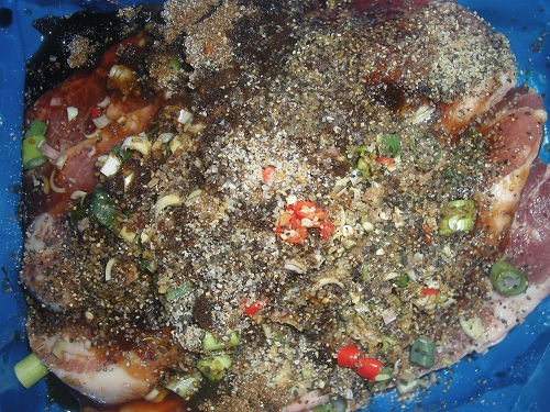 Heat oil in a large skillet over medium-high heat. Sear marinated pork chops in the hot oil. Cook on each side for about 3 to 5 minutes, until golden on the outside pour the rest of the marinade over the chops and add 1 tablespoon water. Cover with foil and bake in the oven to 375 degrees F for 15 minutes then remove foil and bake another 10 minutes until golden. The leftover marinade I cooked in a saucepan until thickens.